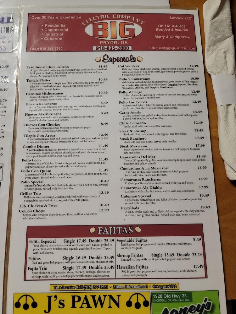 Discover the vibrant flavors of Mexico at Los Cocos, conveniently located at 122 W Ferry St, Salina, OK. This charming restaurant offers a relaxed ambiance perfect for any occasion, whether it's a solo lunch or a enjoyable dinner with friends. Indulge in our delicious menu featuring traditional dishes, excellent cocktails, and local specialties, complemented by a diverse selection of beers. Enjoy dining on our inviting terrace or opt for takeout and delivery services. With accessible seating and amenities, plus a kid-friendly menu, Los Cocos caters to everyone. Join us for a delightful dining experience today!